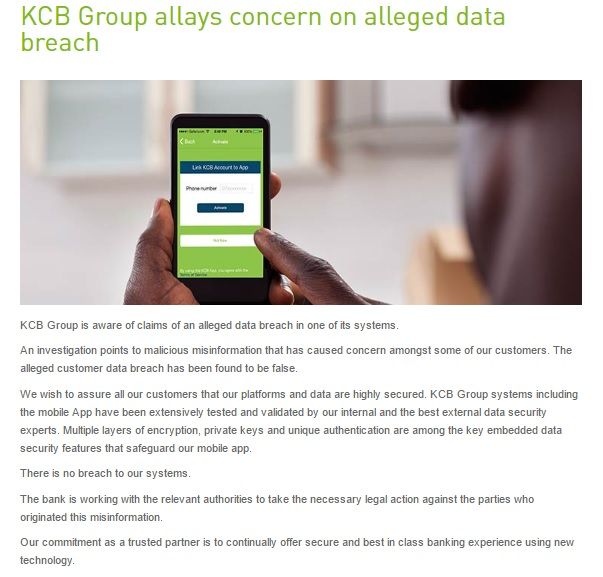 When contacted for comment, KCB responded that they were aware of the claims of a data breach, and all customer data and platforms were safe.