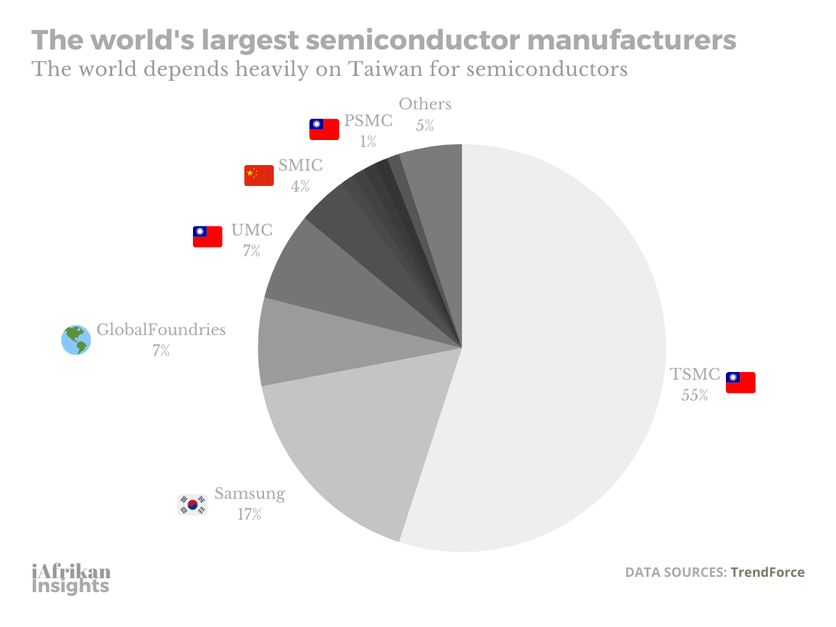 Taiwan Semiconductor Manufacturing Company (TSMC) is by far the world's largest chip producer. It is also the world's sixth most valuable corporation. It sells chips to companies such as Apple, Intel, and Nvidia.