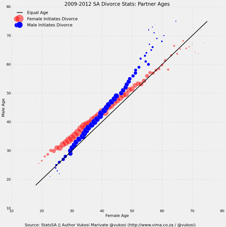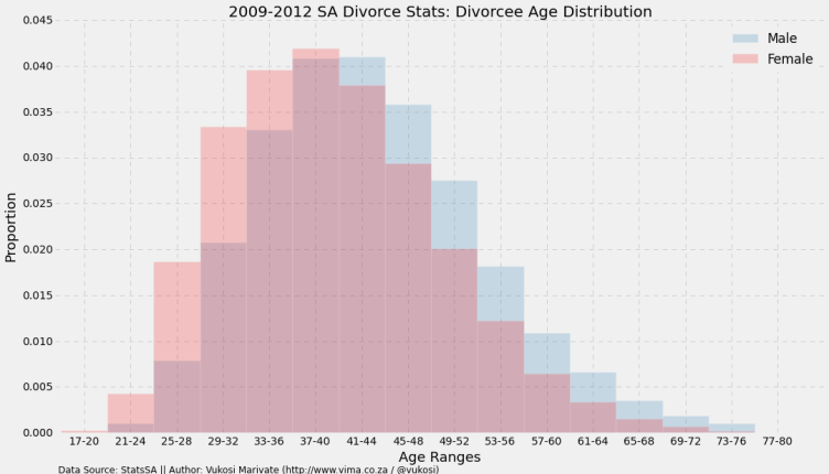 Here we notice that there is slight shift between the peak divorce age for men as compared to women. This is to be expected as women tend to marry men who are2-3 years older. Here is a graphic from Code4SA on the marriage age distribution.