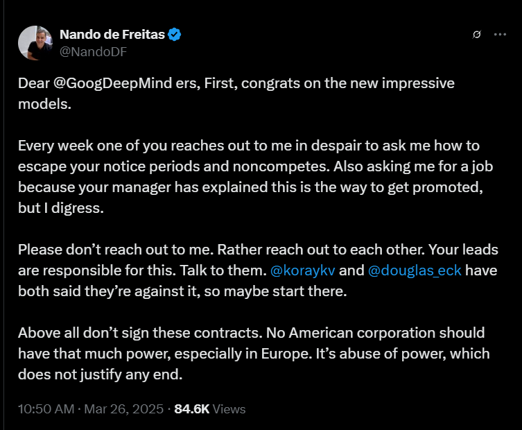 In a rare display of frankness, de Freitas has been active on social media over the past weeks. In a series of scathing tweets, he revealed how many former DeepMind workers had contacted him, feeling nervous, unhappy, and unsure about their future, due to contracts that prevent them from performing meaningful work.