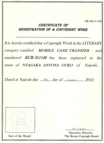 “It is hereby certified that a Copyright Work in the LITERARY category entitled MOBILE CASH TRANSFER and numbered KCB 011146 has been registered in the name of NYAGAKA ANYONA OUKO of Nairobi.”