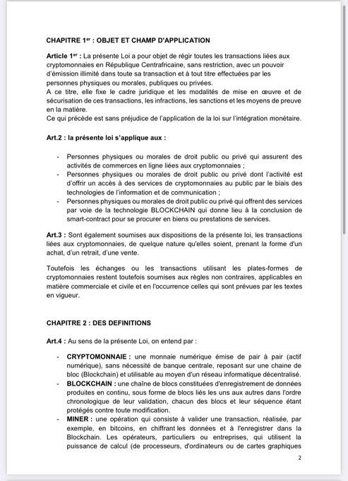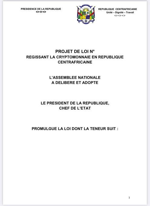 The Parliament of the Central African Republic (CAR) has signed a Bill that will see the country acceptin Bitcoin as legal tender. Gourna Zacko, CAR's Minister of Digital Economy, and Calixte Nganongo, CAR's former Minister of Finance and Budget, both proposed the draft law which will also seek to establish a regulatory framework for the domestic cryptocurrency industry.