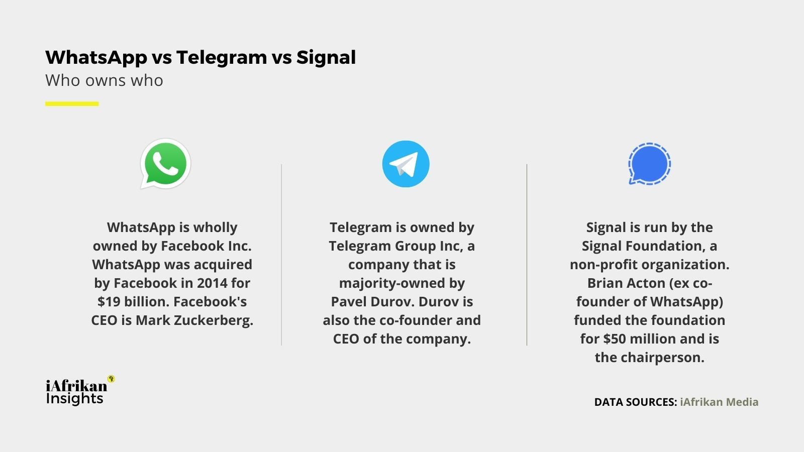 Both WhatsApp and Telegram are privately-owned. Also, if you may, both are controlled (from voting at a board-level perspective) by CEOs who have a background in creating social media platforms. Pavel Durov, together with his brother, is known for creating VK, one of Russia's largest social networking platforms. While on the other hand, Mark Zuckerberg founded Facebook and currently serves as its CEO.