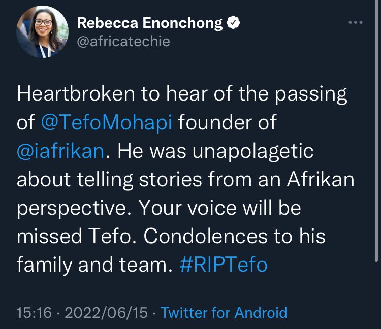 Following the news of his passing, tweets from Afrika and her intelligentsia described how they downloaded his wisdom onto their hard drives as they journeyed in the pursuit of their mastery "I never had the opportunity to speak with TefoMohapi, but I undoubtedly drew inspiration from him and iAfrikan's work when I founded Digest Africa. We shall always remember his contribution to African technology. Fund for Africa's Future's Peter Kisadha. Siphumelele Zondi, SABC Network Among your other contributions to tech in Africa, "You fought a good fight and played a significant role in the telling of Africa's tech story" added in his testimonial.