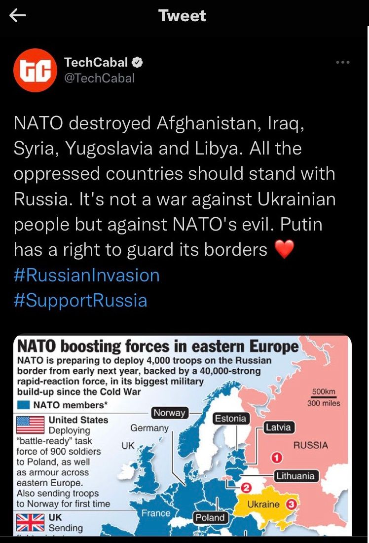 Sometime during the night of 27 February 2022, something peculiar appeared on Twitter. A tweet by Afrikan digital technology publication, TechCabal, appeared with a message in support of Russia's invasion of Ukraine.